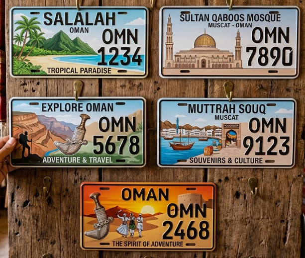 The Oman License Plate Souvenir is a unique and eye-catching decorative accessory inspired by the design of a traditional license plate and the bold colors of the Omani flag. This beautifully crafted souvenir proudly represents the heritage and national identity of the Sultanate of Oman, making it a perfect keepsake for travelers and collectors of Oman souvenirs. Whether displayed on a wall, placed on a desk, or used as a decorative piece at home or in the office, this Oman license plate souvenir adds a vibrant cultural touch to any space. Popular among tourists visiting Muscat, Salalah, and other famous destinations in Oman, it is also a thoughtful gift from Oman for friends and family who want to remember the beauty, culture, and traditions of this remarkable country.
